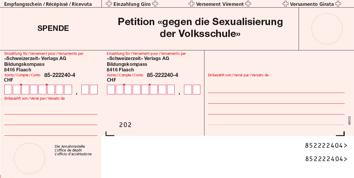 Die administrative Abwicklung der Petition erfolgt durch den zum «Schweizerzeit»-Verlag gehörenden «Bildungskompass». Alle Spenden, die mit dem speziell bezeichneten Einzahlungsschein überwiesen werden, werden vollumfänglich für die Petition gegen die Sexualisierung der Volksschule verwendet.